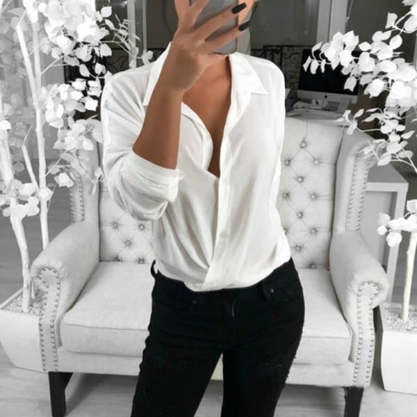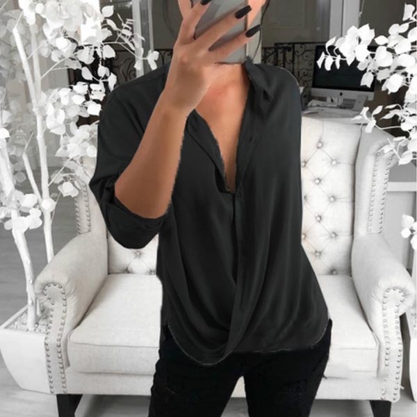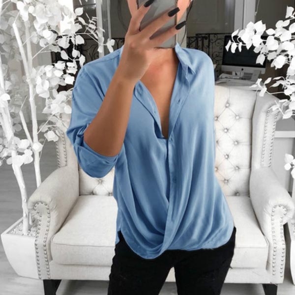 This blouse comes with a solid color,simple yet generous,while the crossover v-neck design will enhance