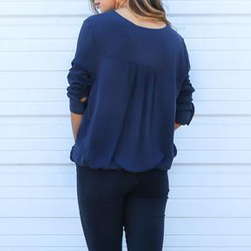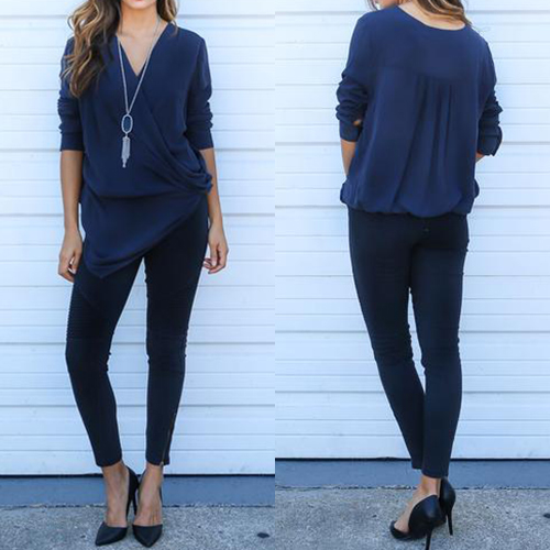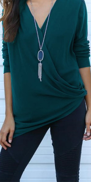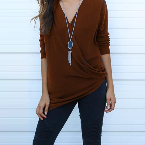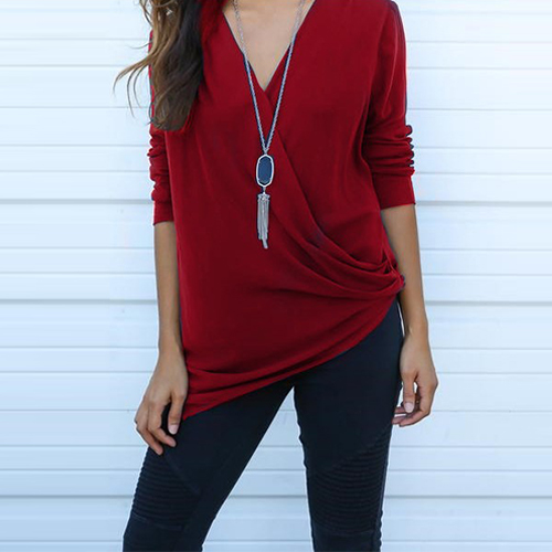 Update your casual ensemble with this t-shirt. Solid color style,with long sleeve and crossover v-neckline