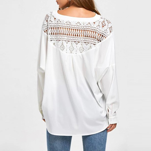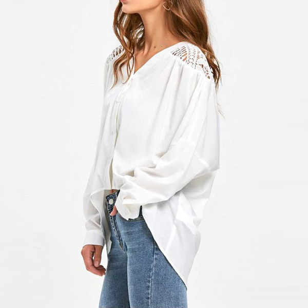 This blouse comes with a classic yet stylish white tone,the lace spliced and high-low hem design break