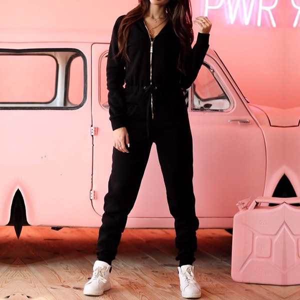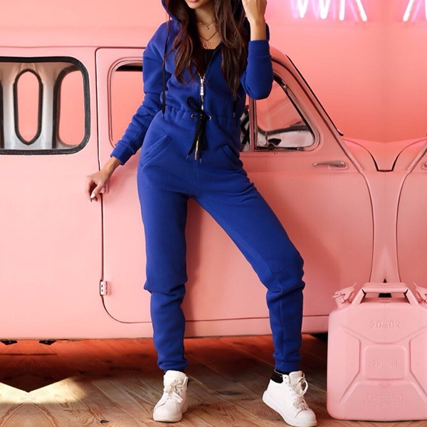 Fashion Solid Color Long Sleeve High Waist Hooded Sports Jumpsuit