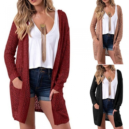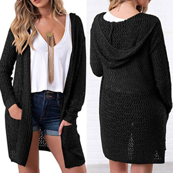 Fashion Solid Color Long Sleeve Hooded Knit Cardigan
