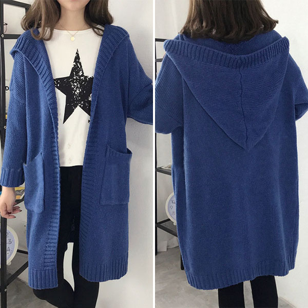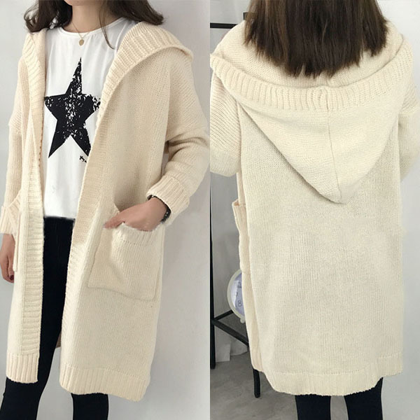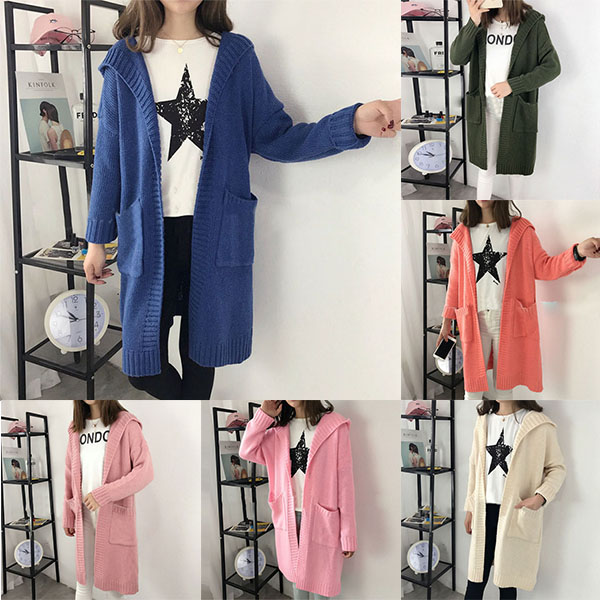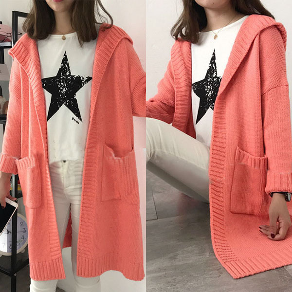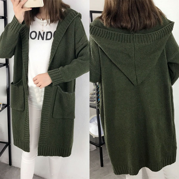 Fashion Solid Color Long Sleeve Hooded Open-front Knit Cardigan