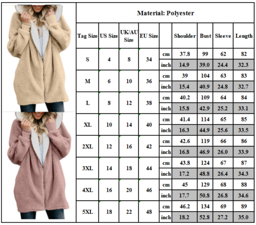 XXXXL : Bust : 129cm(50.79"); Shoulder : 45cm(17.72"); Sleeve : 68cm(26.77"); Length : 88cm(34.65");