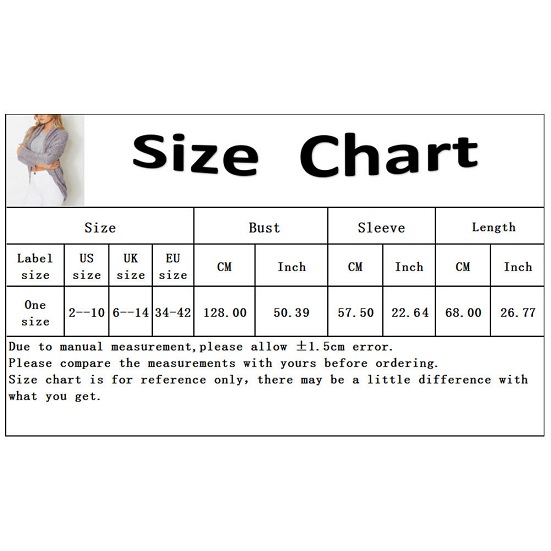 Bust : 128cm(50.39"); Sleeve : 57.5cm(22.64"); Length : 68cm(26.77"); Hem : 16cm(6.3");