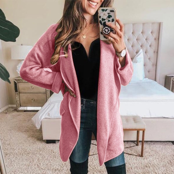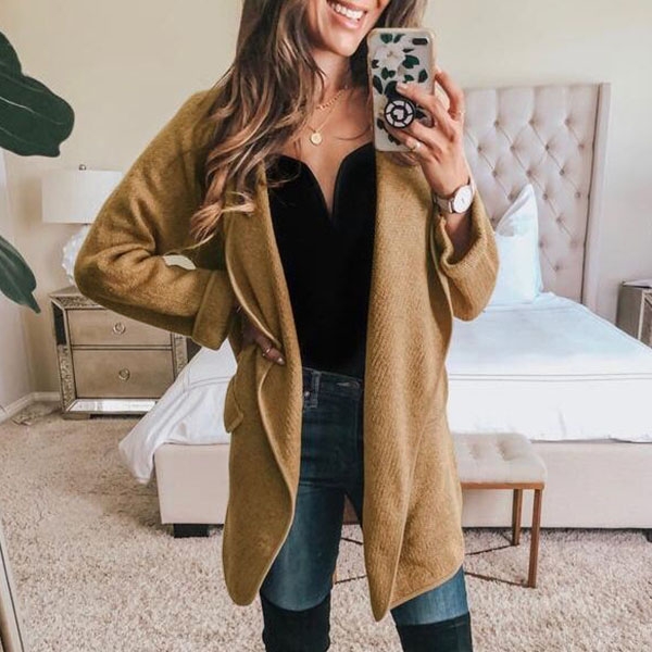 the weather gets chilly. Solid color style,with long sleeve and lapel design,this piece bears a simple