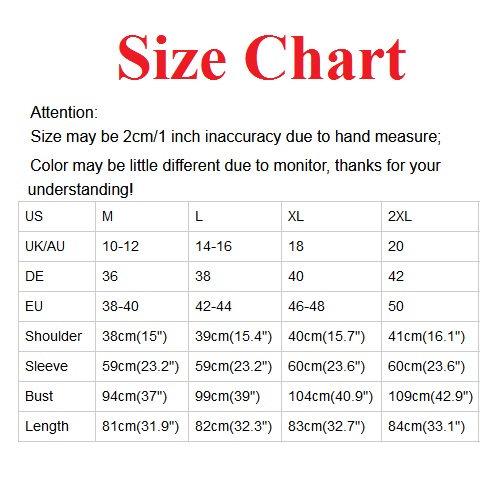 XL : Bust : 104cm(40.94"); Shoulder : 40cm(15.75"); Sleeve : 60cm(23.62"); Length : 83cm(32.68");