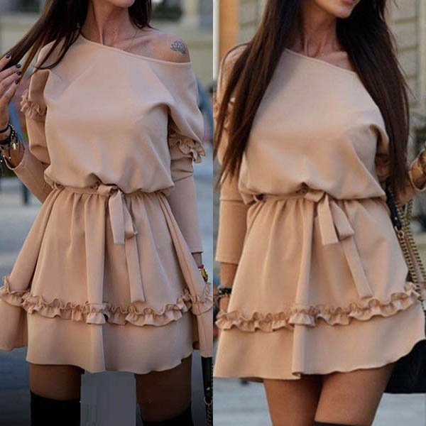 Coming with a solid color,the oblique shoulder and ruffle design make this piece look more attractive.