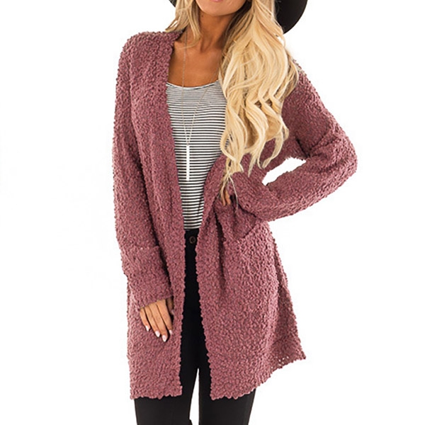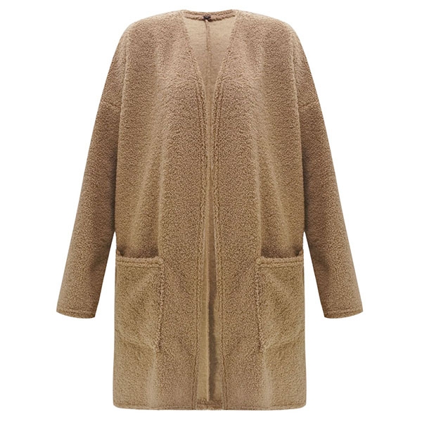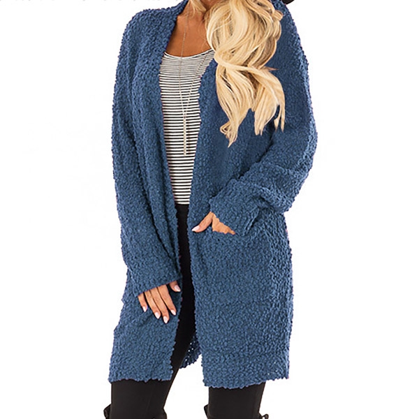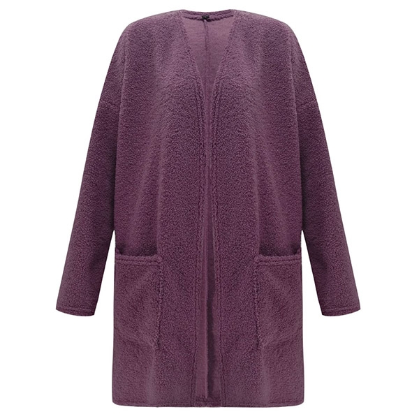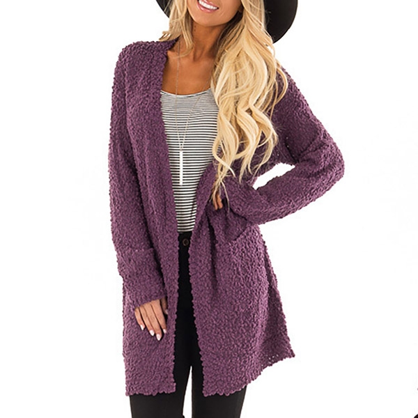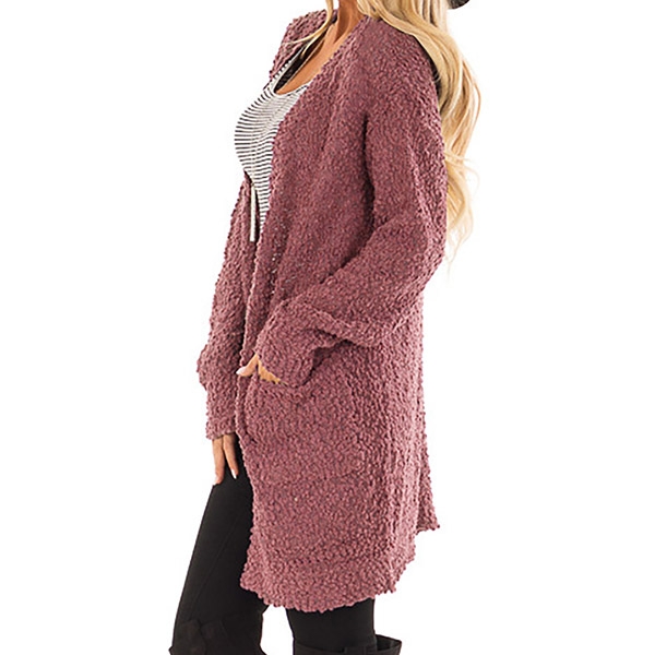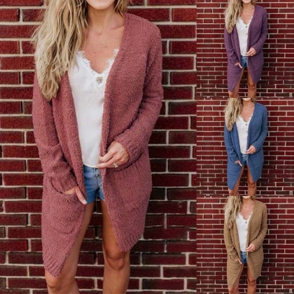 focused on this plush cardigan. It is designed with solid color,long sleeve,front pockets and a loose
