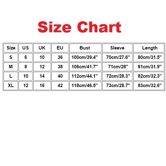 XL : Bust : 118cm(46.46"); Shoulder : 73cm(28.74"); Length : 83cm(32.68");