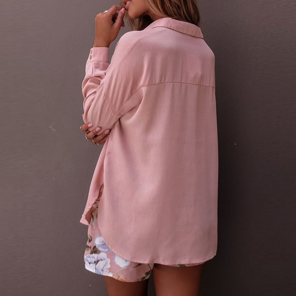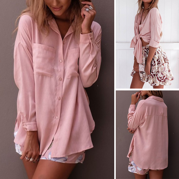 This shirt boasts a sweet pink tone,accompanied with long sleeve,POLO collar and a loose silhouette,simple,classic and cozy.
