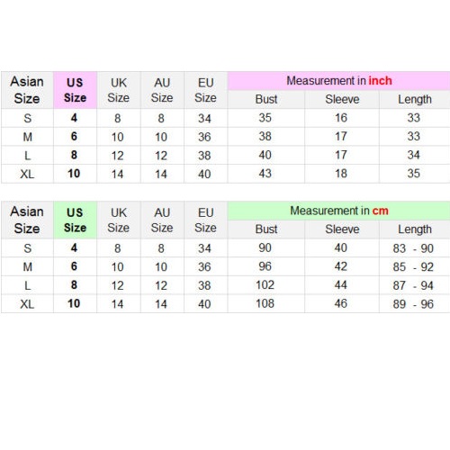 XL : Bust : 108cm(42.52"); Sleeve : 46cm(18.11"); Length : 89cm - 96cm(35.04" - 37.8");