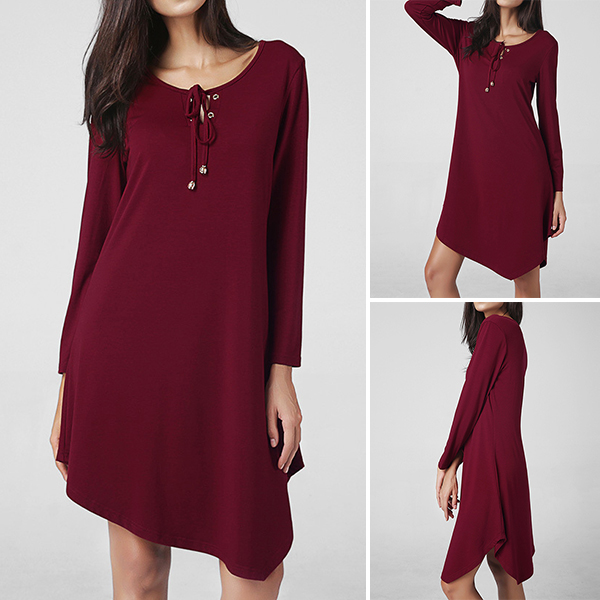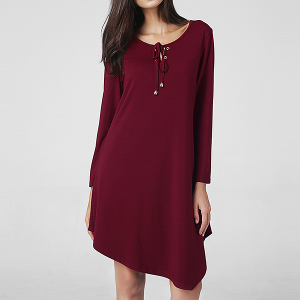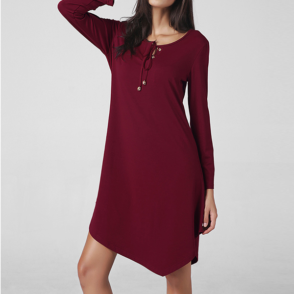 round neck and an irregular hem,this dress is a perfect definition of cozy and stylish. Neckline with lace-up design