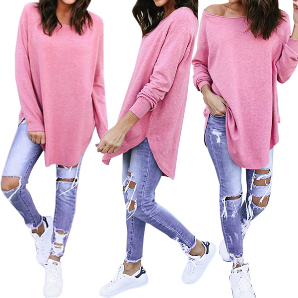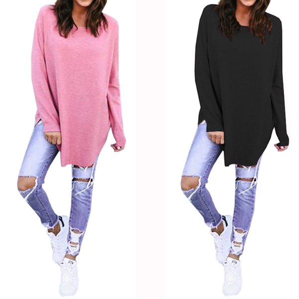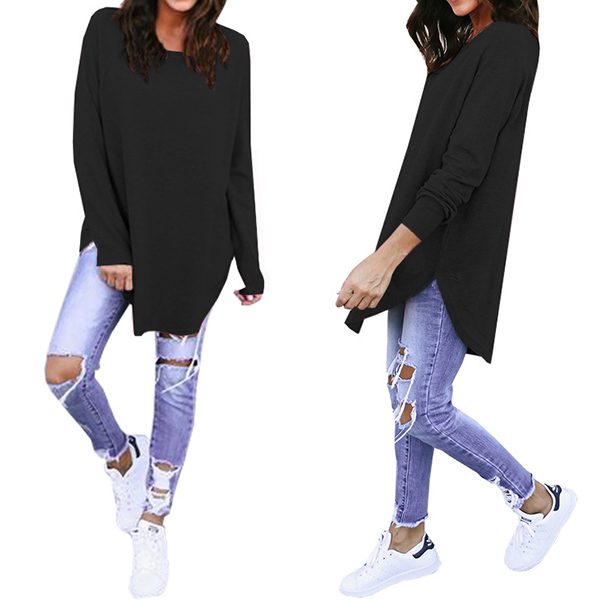 Fashion Solid Color Long Sleeve Round Neck Irregular Hem Loose T-shirt