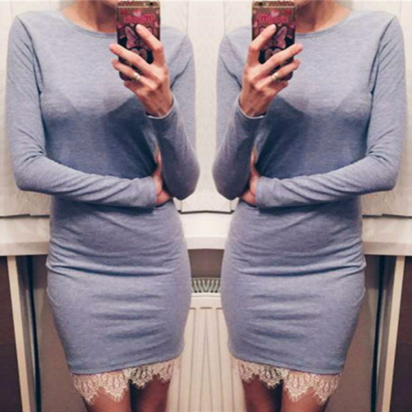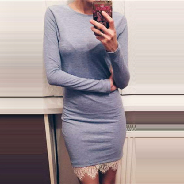 a solid color,finished with long sleeve,round neck,lace spliced hem and a fit silhouette,this dress can offer