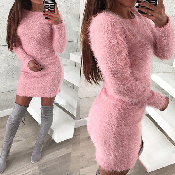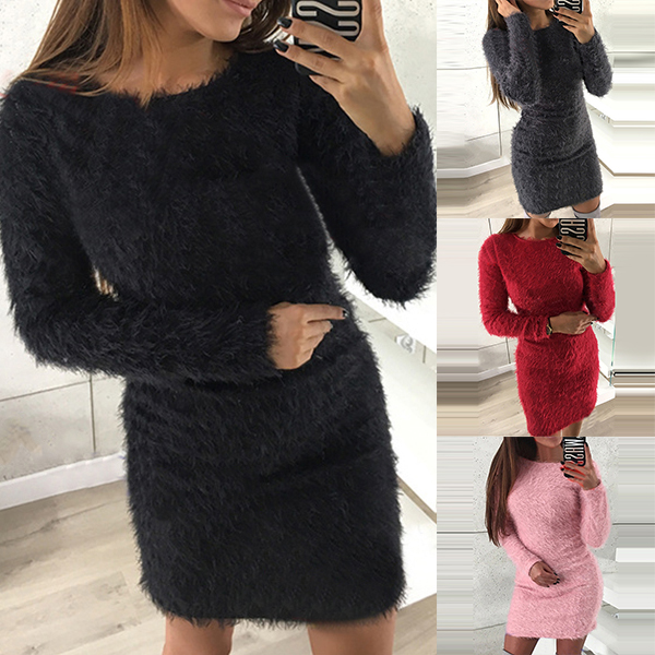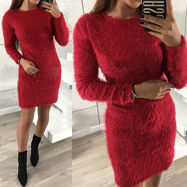 Fashion Solid Color Long Sleeve Round Neck Plush Tight Dress (A bit short)