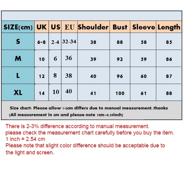 S : Bust : 88cm(34.65"); Shoulder : 38cm(14.96"); Sleeve : 58cm(22.83"); Length : 81cm(31.89");