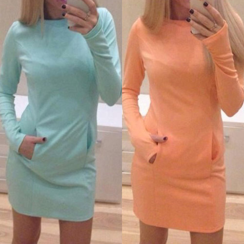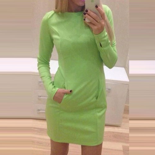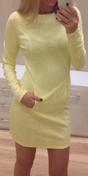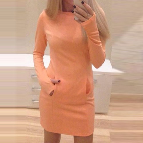 long-sleeved dress, for example. Solid color style,outfitted with long sleeves,round neckline