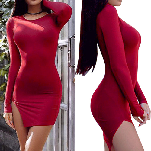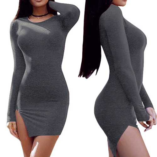 This solid color dress is styled with long sleeve,round neck,slit hem and a super fit silhouette,your feminine curve and sexy style will shine in this dress.