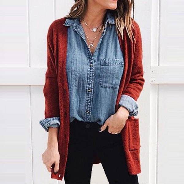 This knit cardigan can give you an easy transition from the summer to the winter. It features a solid color,