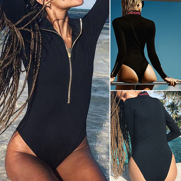 bodysuit. Boasts a classic and mysterious black tone,finished with long sleeve,stand collar and a tight silhouette,