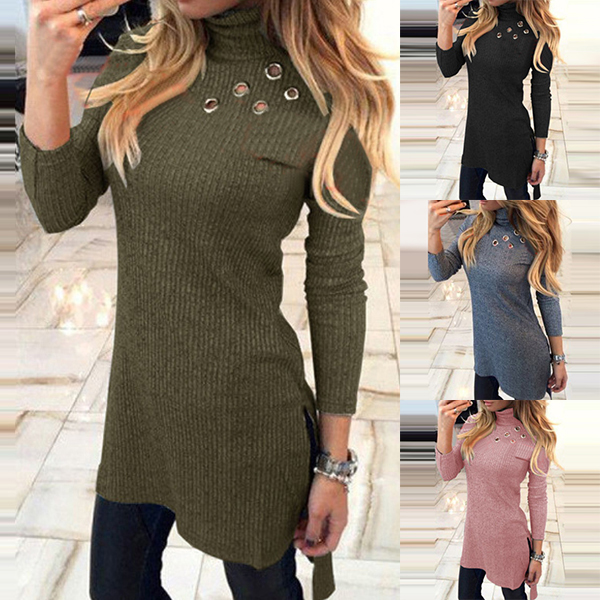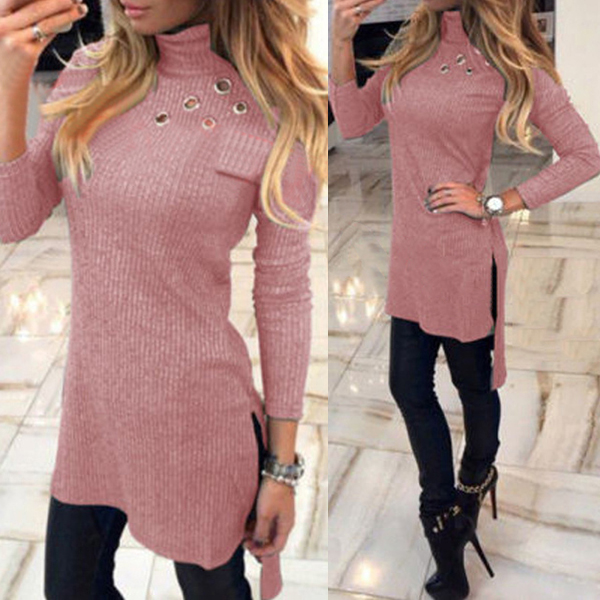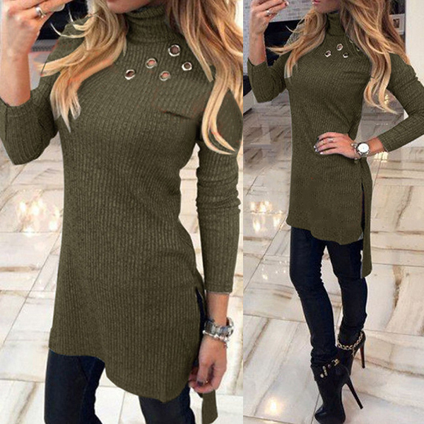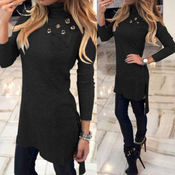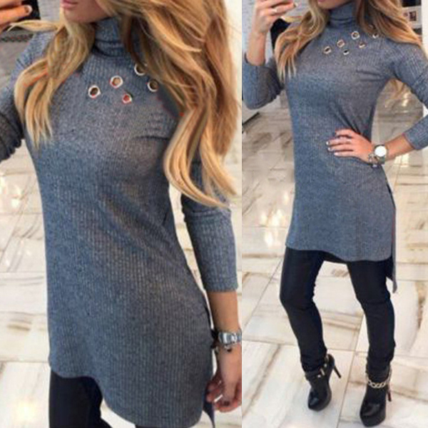 long sleeve,turtleneck,a fit silhouette and a high-low hem,this dress is a good way to portray your slender figure.