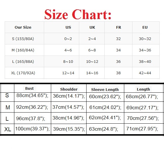S : Bust : 88cm(34.65"); Shoulder : 36cm(14.17"); Sleeve : 60cm(23.62"); Length : 68cm(26.77");