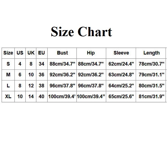 XL : Bust : 100cm(39.37"); Sleeve : 65cm(25.59"); Length : 81cm(31.89");