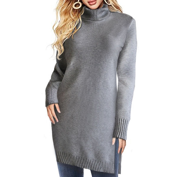 Fashion Solid Color Long Sleeve Turtleneck Slit Hem Sweater