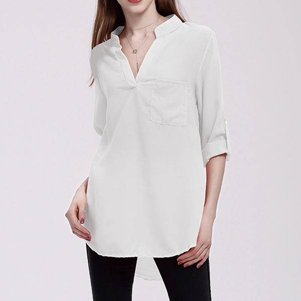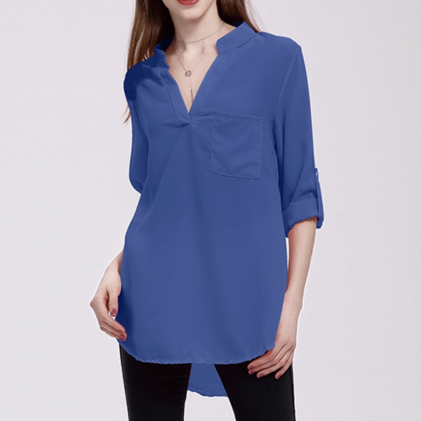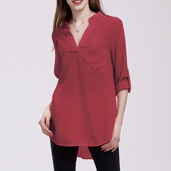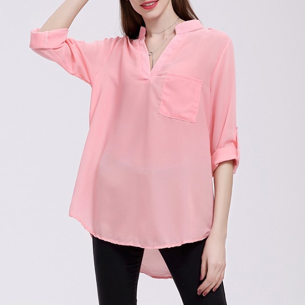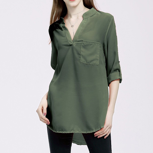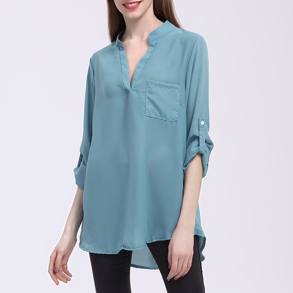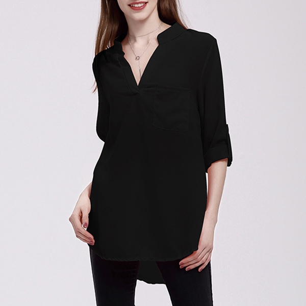Comes with a solid color,finished with long sleeve,v-neck,a chest pocket and high-low hem design,
