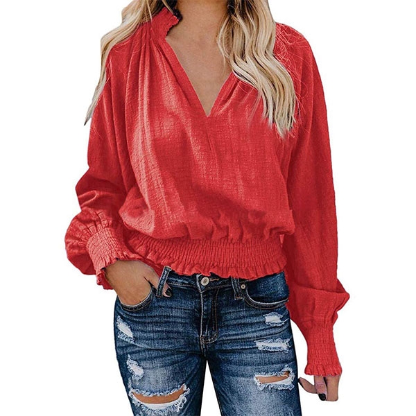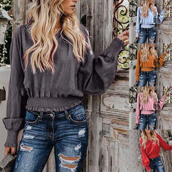 Fashion Solid Color Long Sleeve V-neck Elastic Hem Top