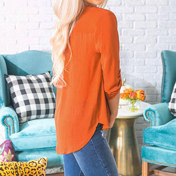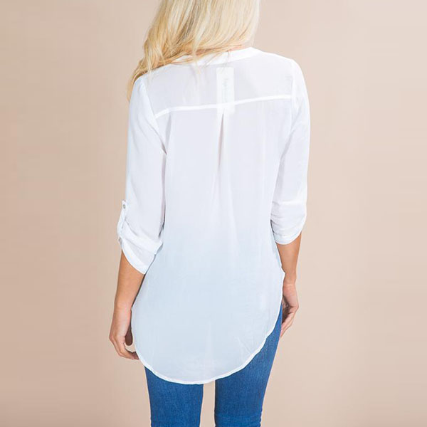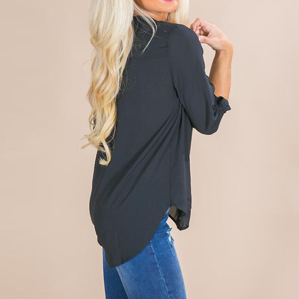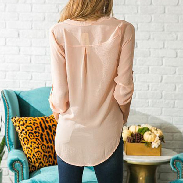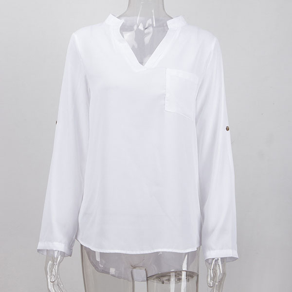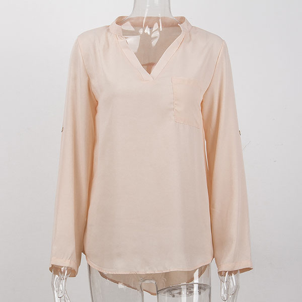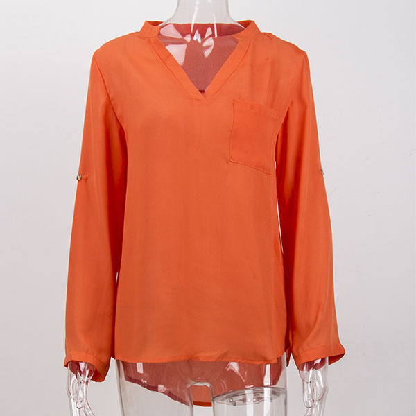 This chiffon blouse is designed with a solid color tone,accompanied with long sleeve,v-neck and a high-low hem,