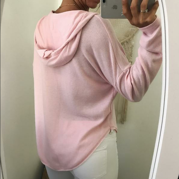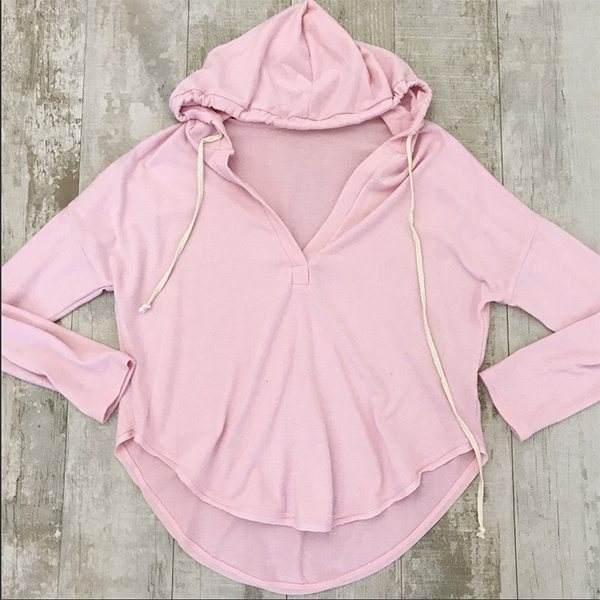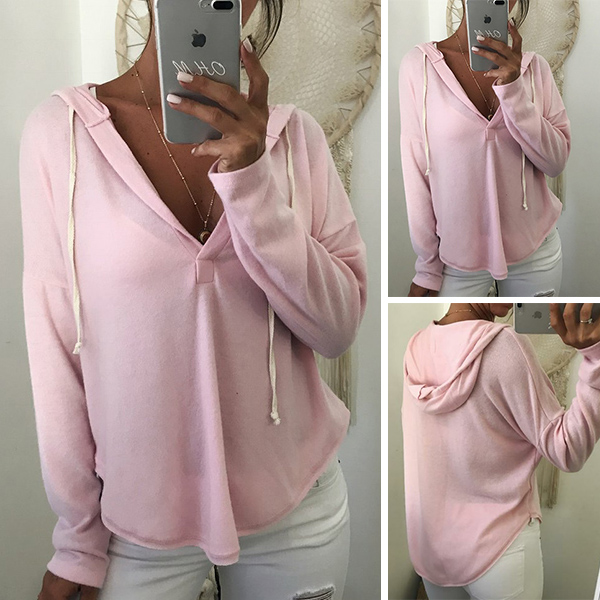 Boasts a sweet pink tone,accompanied with long sleeve,v-neck,high-low hem and a hooded silhouette,this hoodie