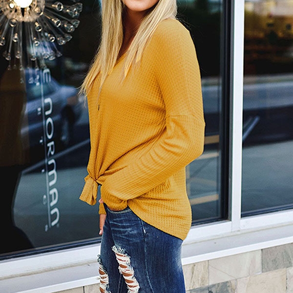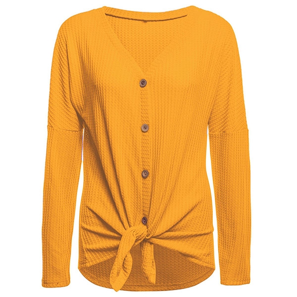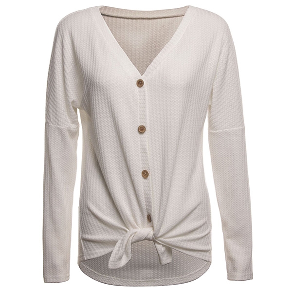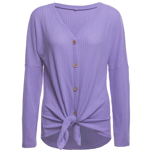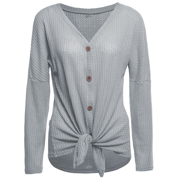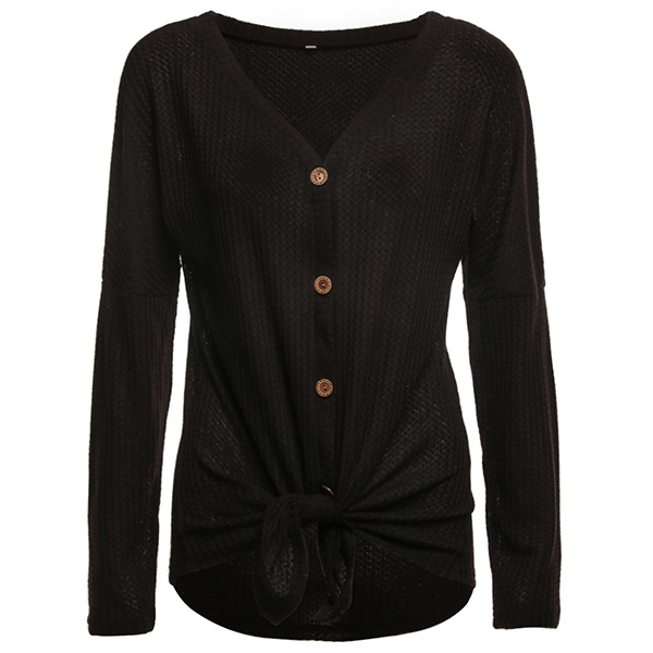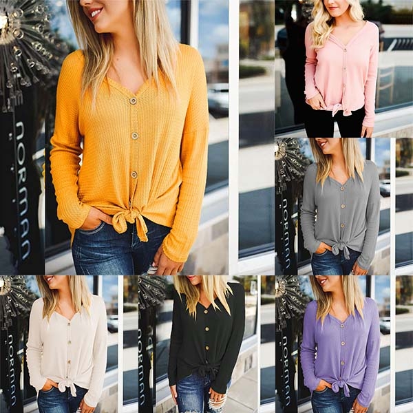 a place in your wardrobe. Boasts solid color,long sleeve,v-neck and front buttons design,this simple