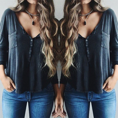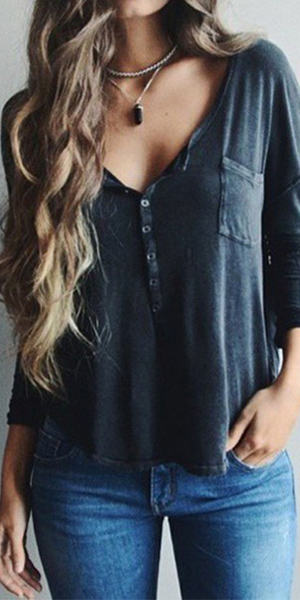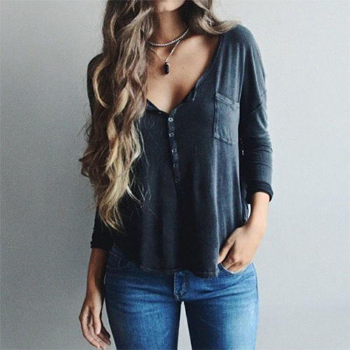 with long sleeve,v-neckline and a loose silhouette,can keep you comfy all day. Neckline decorated