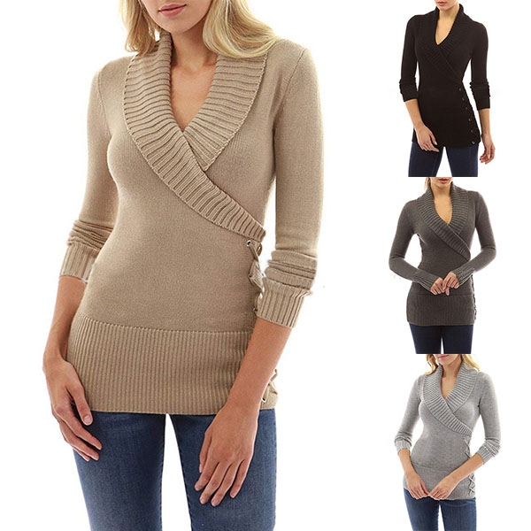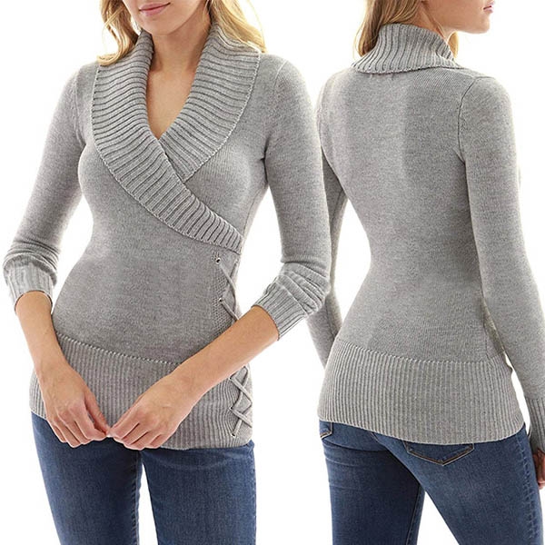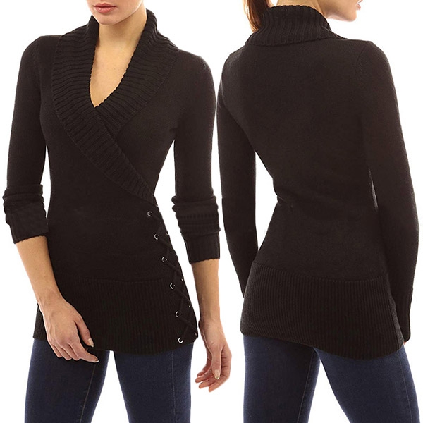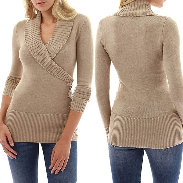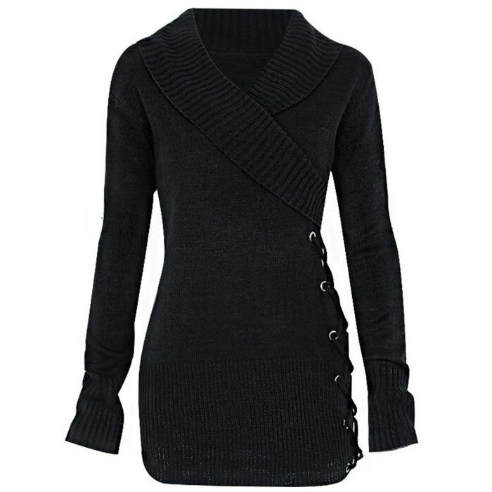 It features solid color,long sleeve,v-neck and a fit silhouette,cozy yet feminine. And the side lace-up