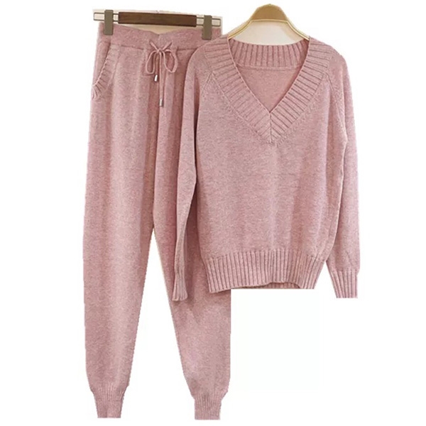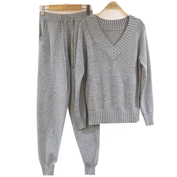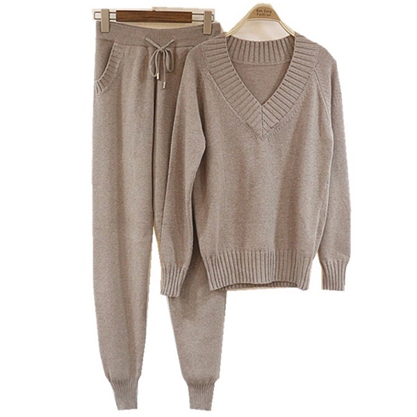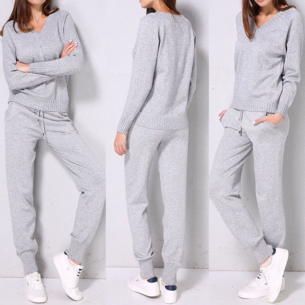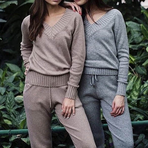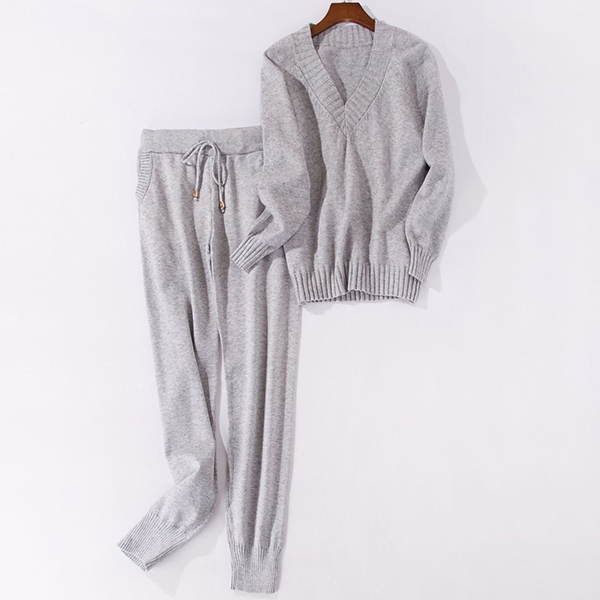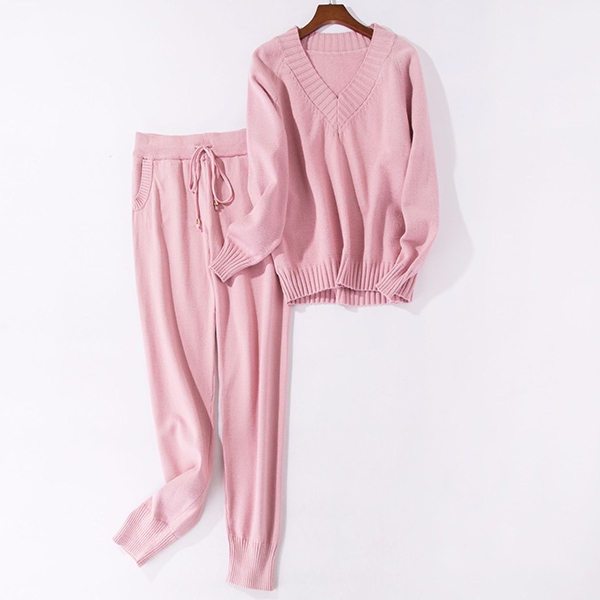sleeve v-neck sweater and a knit pants,which not only can keep you warm,but also can offer you a simple,