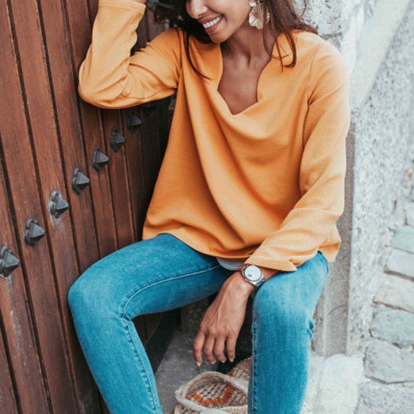 bright yellow tone,the wavy v-neck and back-button design make this piece look so attractive