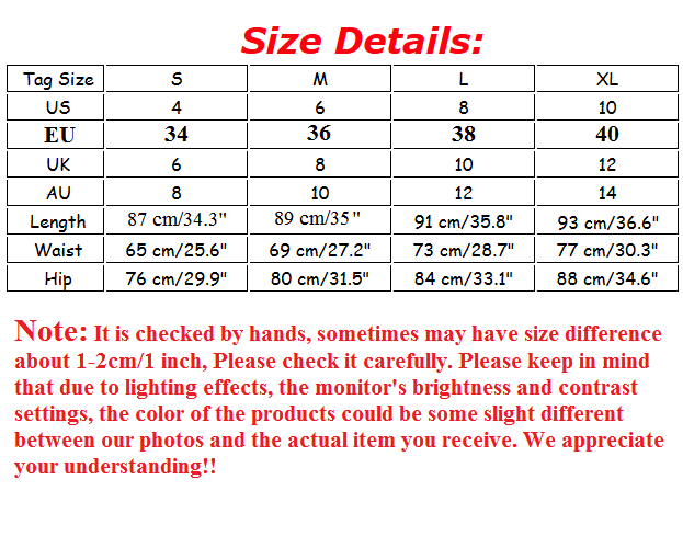S : Waist : 65cm(25.59"); Hips : 76cm(29.92"); Length : 87cm(34.25");
