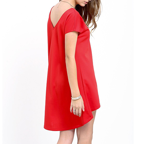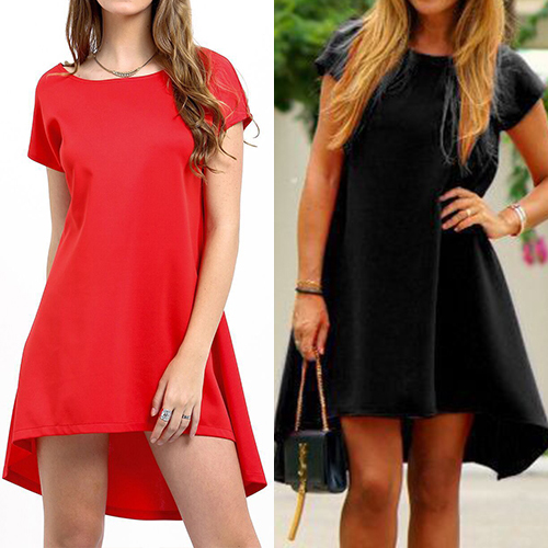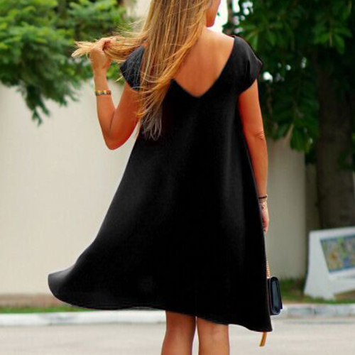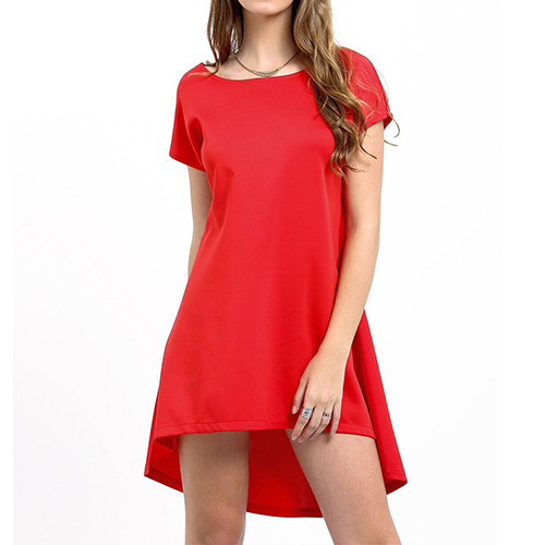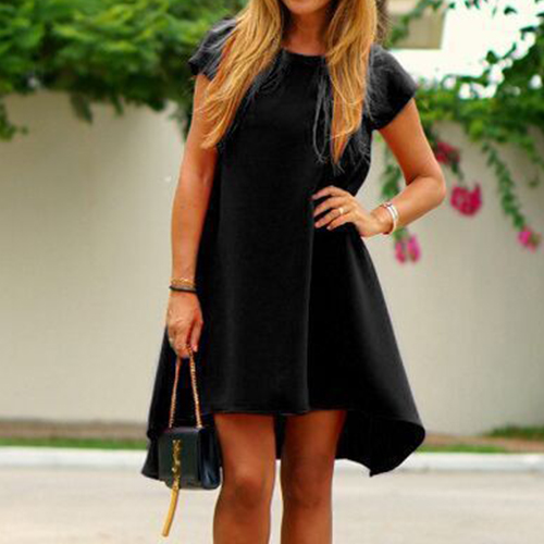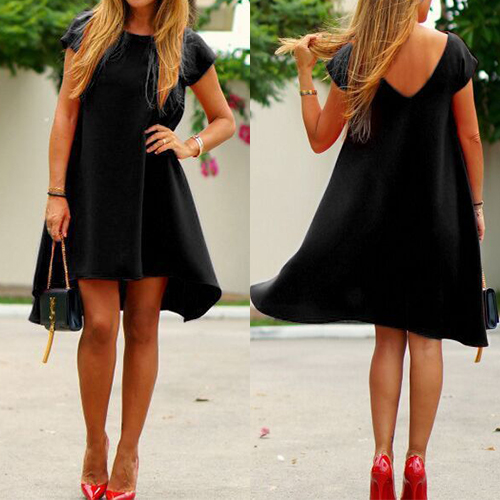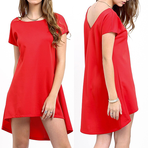 This dress features round neck, short sleeve, backless and irregular hem design, solid color style,