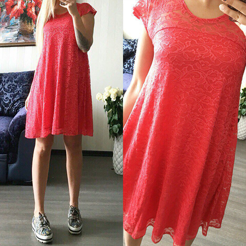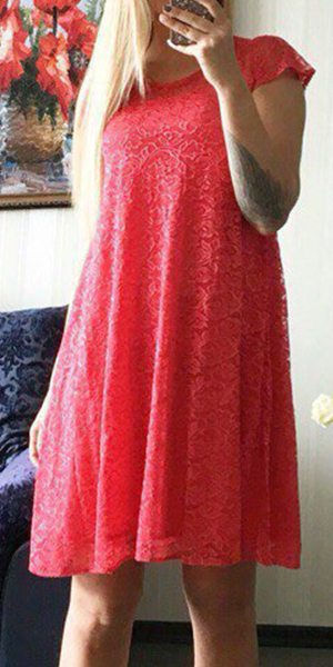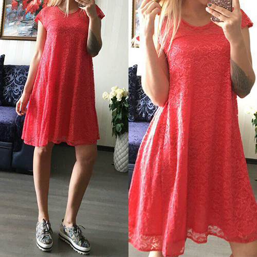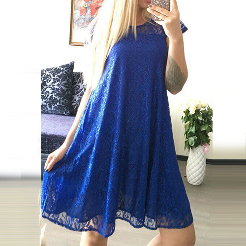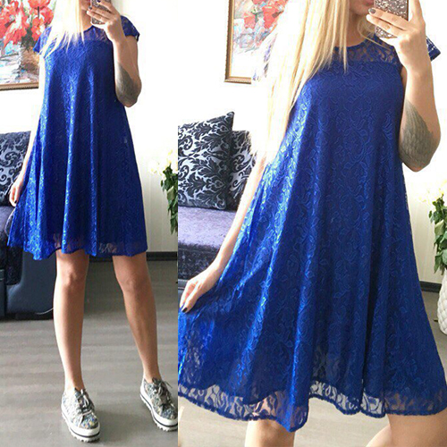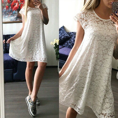 A relaxed silhouette with hollow out, round neck and short sleeve design, this lace dress is designed