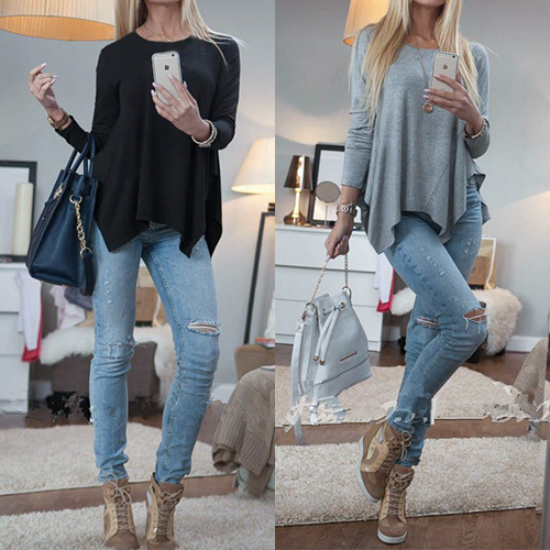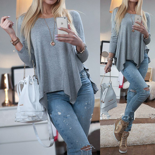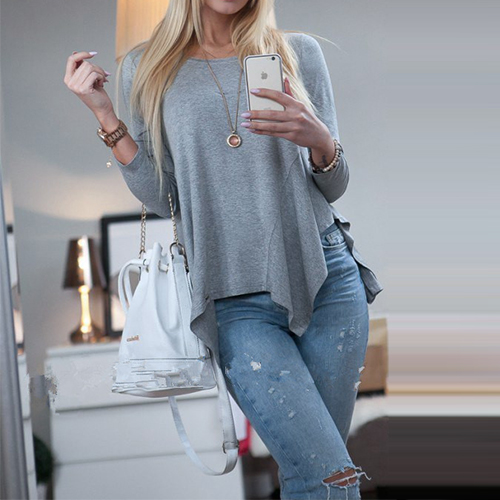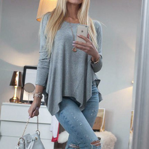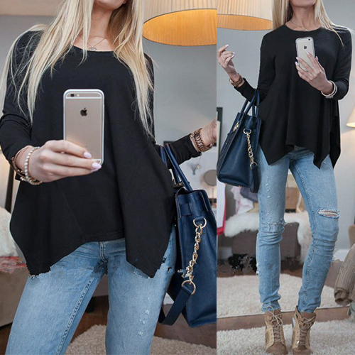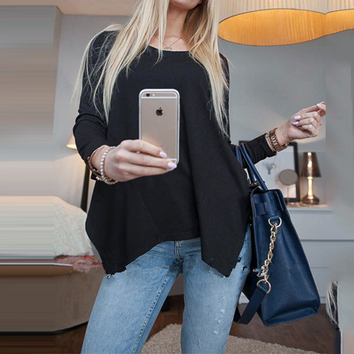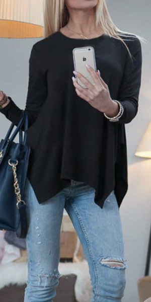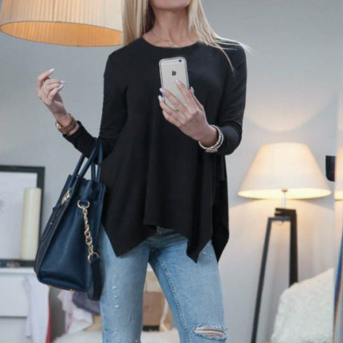 designed with a basic round neckline and long sleeves while it is also styled with an irregular hemline,