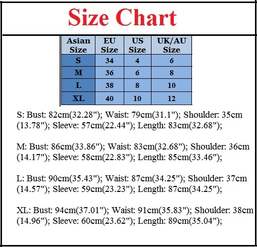 XL : Bust : 94cm(37.01"); Waist : 91cm(35.83"); Shoulder : 38cm(14.96"); Sleeve : 60cm(23.62"); Length : 89cm(35.04");