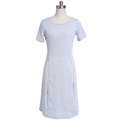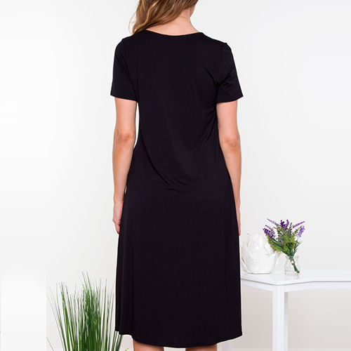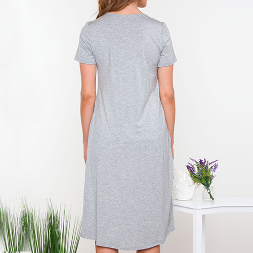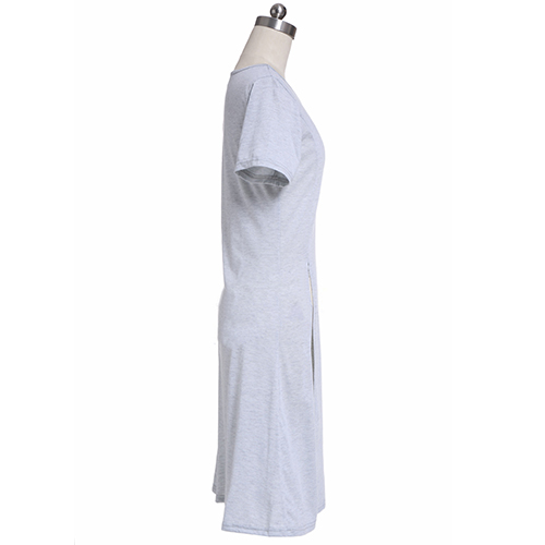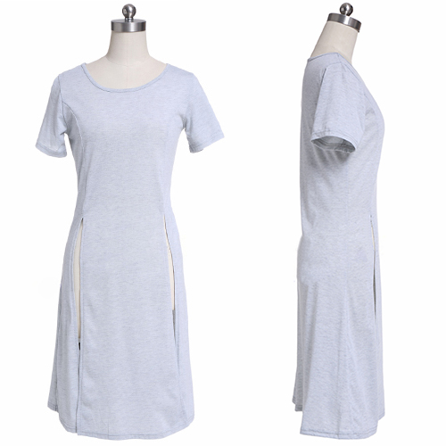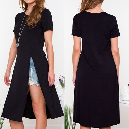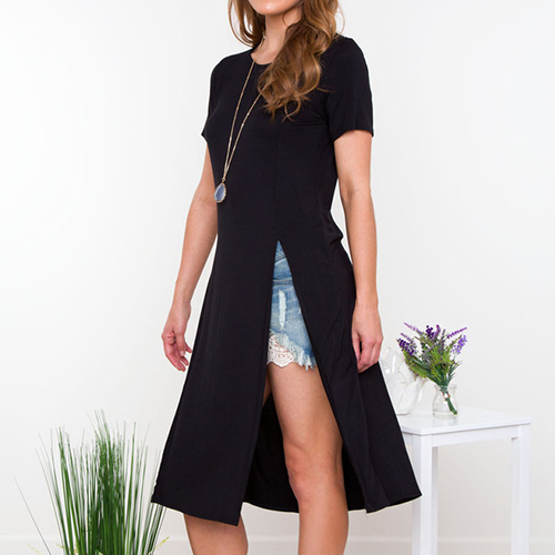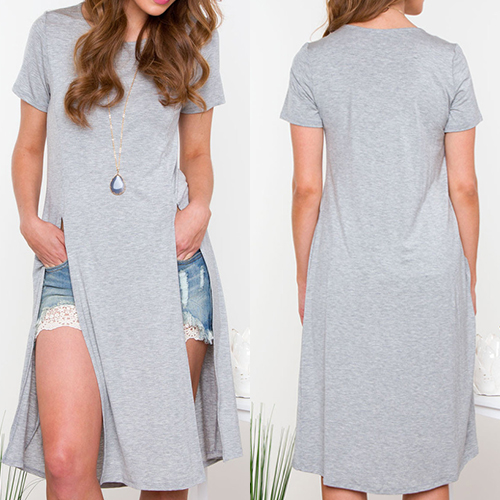 This t-shirt is longline style and it is solid color. What's more, this t-shirt is designed with a round neckline and short sleeves. Moreover,
