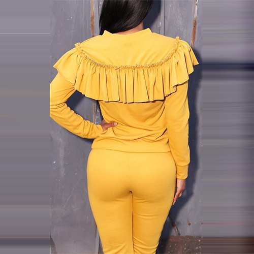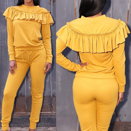a long sleeve ruffle sweatshirt and a drawstring pants,crafted from soft and breathable fabric,this sports suit can keep you cozy yet stylish.