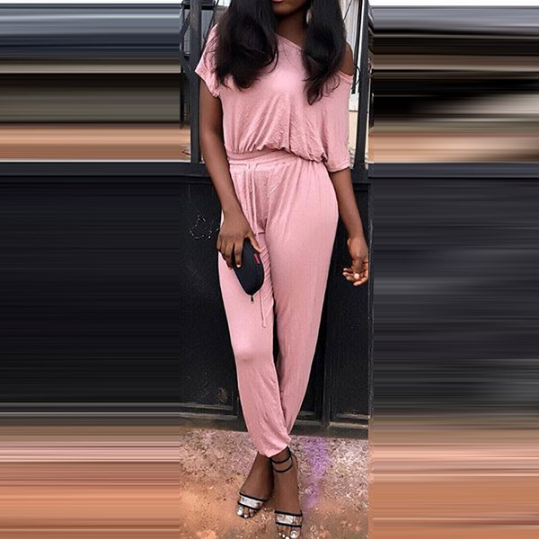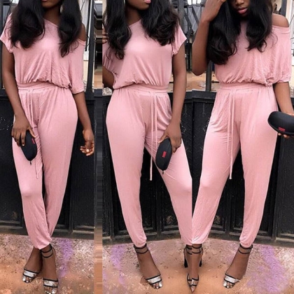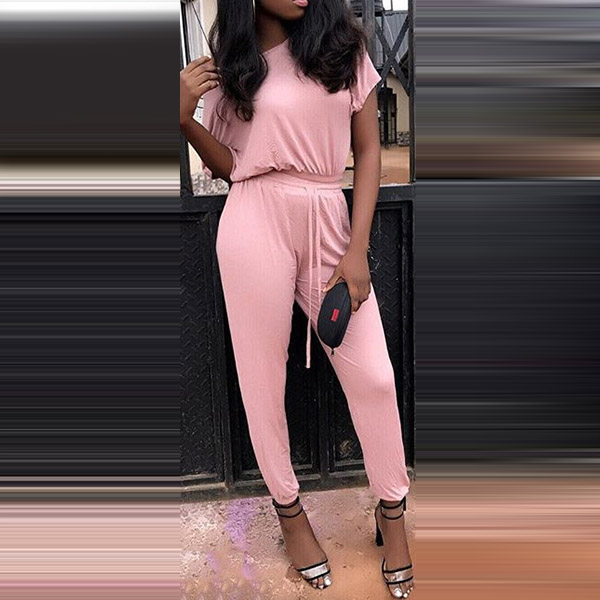 This jumpsuit comes with a sweet yet stylish pink tone,finished with short sleeve,boat neck and high