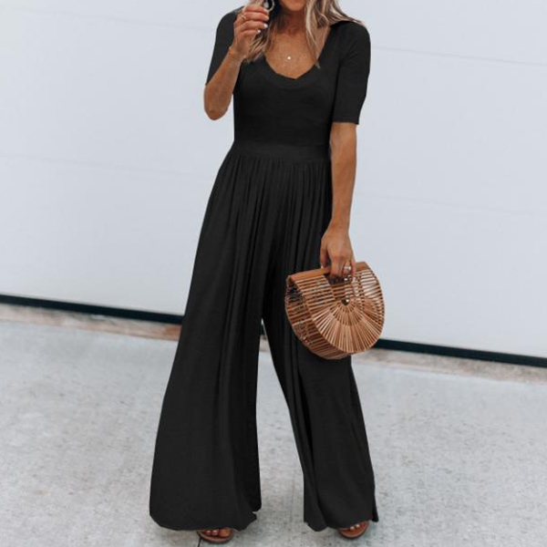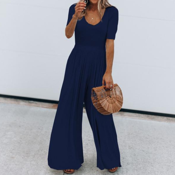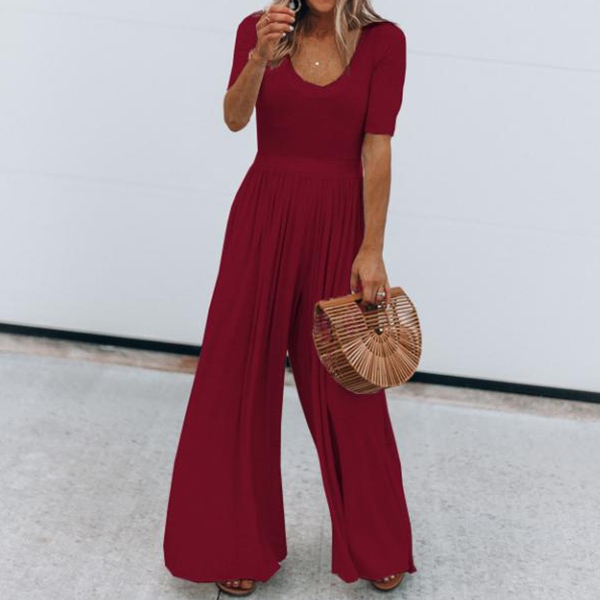with short sleeve,round neck,high waist and wide-leg silhouette design,this piece is sure to
