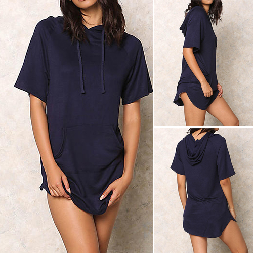 Solid color style,designed with short sleeve,hooded and a loose silhouette,this t-shirt dress can