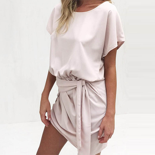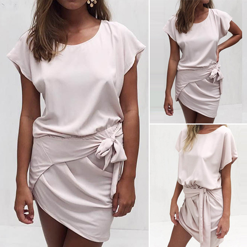 with short sleeve,round neck,an irregular hem and lace-up details at waist part,which is a perfect