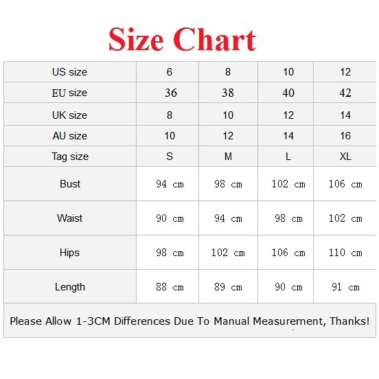 S : Bust : 94cm(37.01"); Waist : 90cm(35.43"); Hips : 98cm(38.58"); Length : 88cm(34.65");