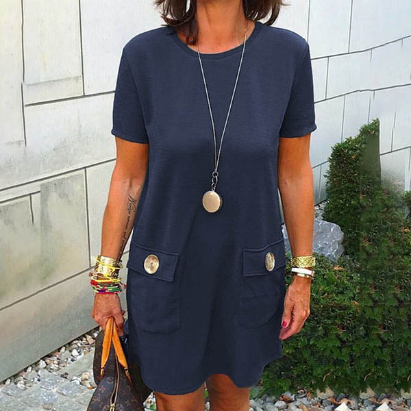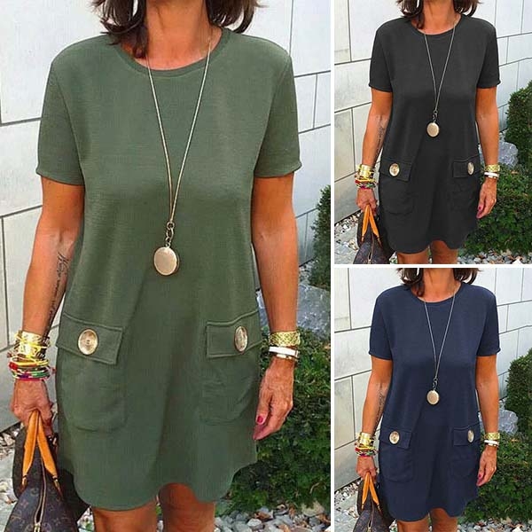 Your daily routine can be made much easier with this dress. Solid color style,with short sleeve,round neck and